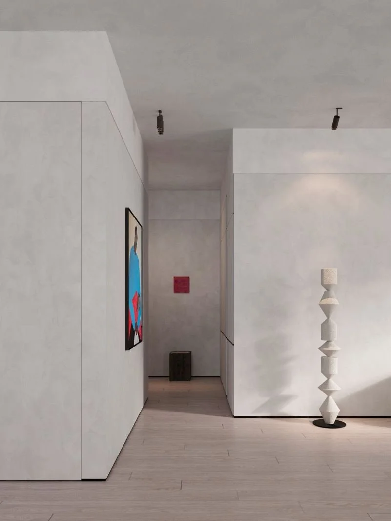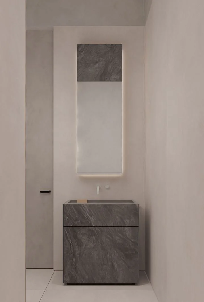 MONO APARTMENT е двуетажен апартамент с площ от 200 кв.м, проектиран като интимно, светло и балансирано пространство. В основата е заложен минимализмът и тактилността — използвани са естествени материали, меки форми и внимание към детайла. Първият етаж включва обединена зона за дневна, кухня и трапезария с модулен диван, който може да се превърне и в легло. На вторият етаж са разположени три спални, две бани и дрешник към една от спалните.