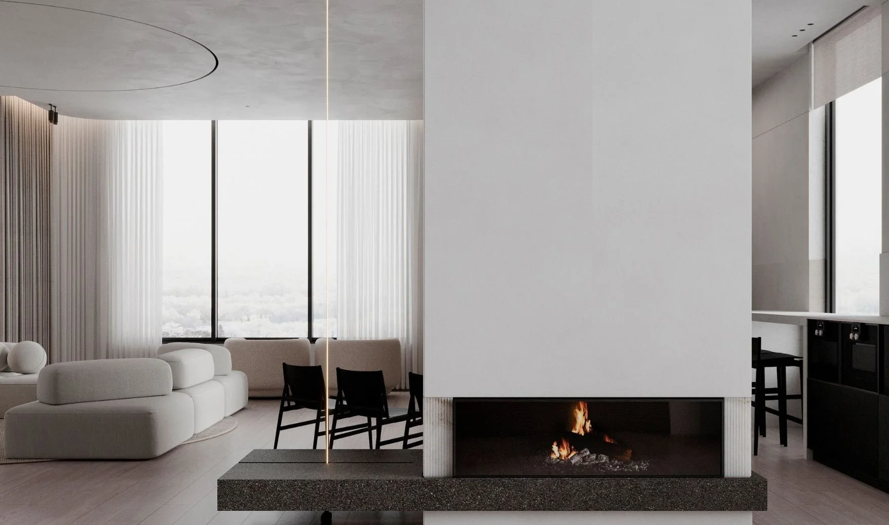 Зоната за дневна е проектирана като място за развлечения, почивка, слушане на винилови плочи и четене. Централният ѝ елемент е голяма висяща лампа, която спуска светлината си от тавана в сърцето на зоната за сядане, разположена между фотьойлите и дивана. Вечер тя създава спокойна и интимна атмосфера, като добавя разнообразие в осветлението и позволява пространството да се адаптира към различни настроения и функции.