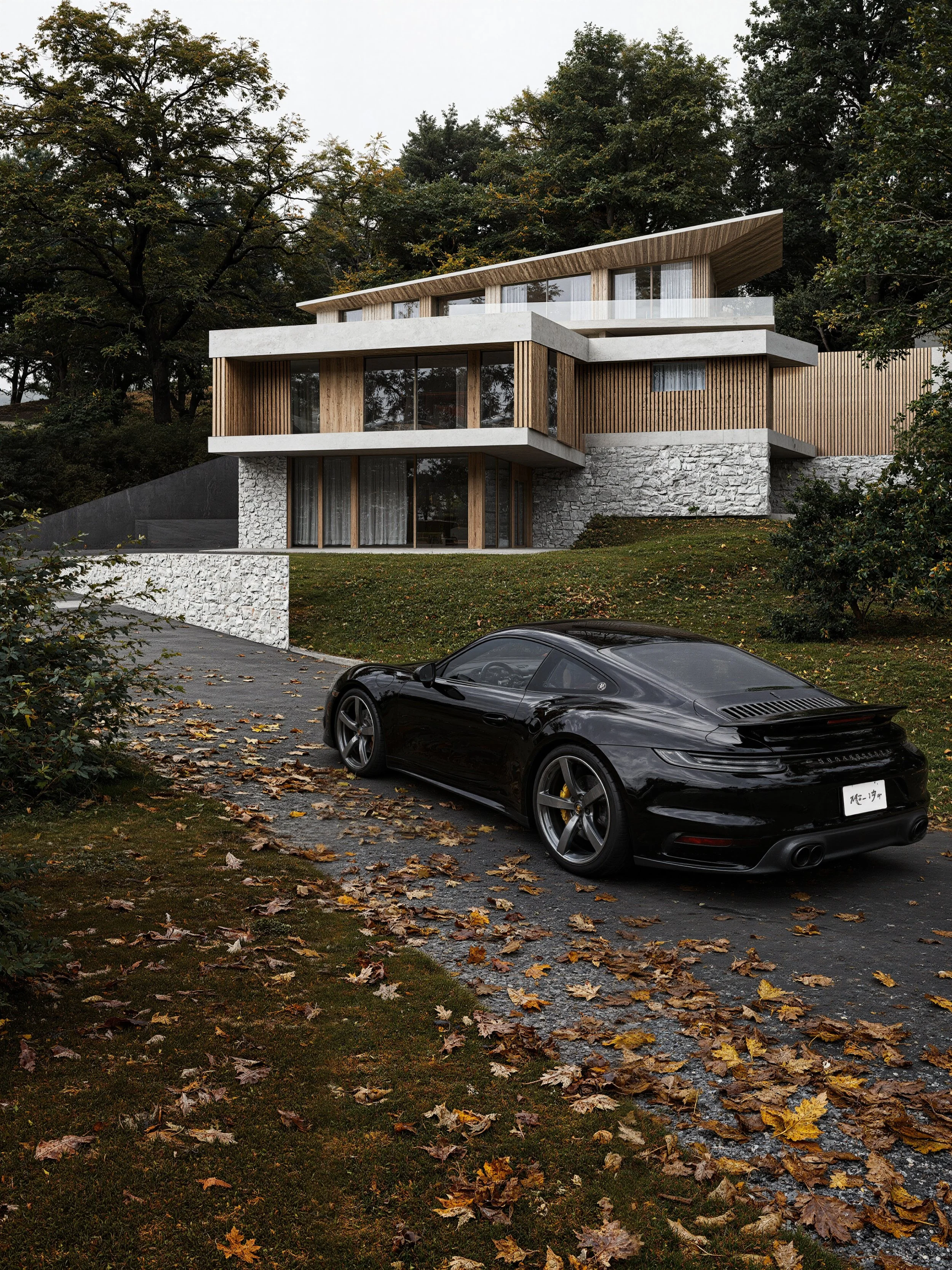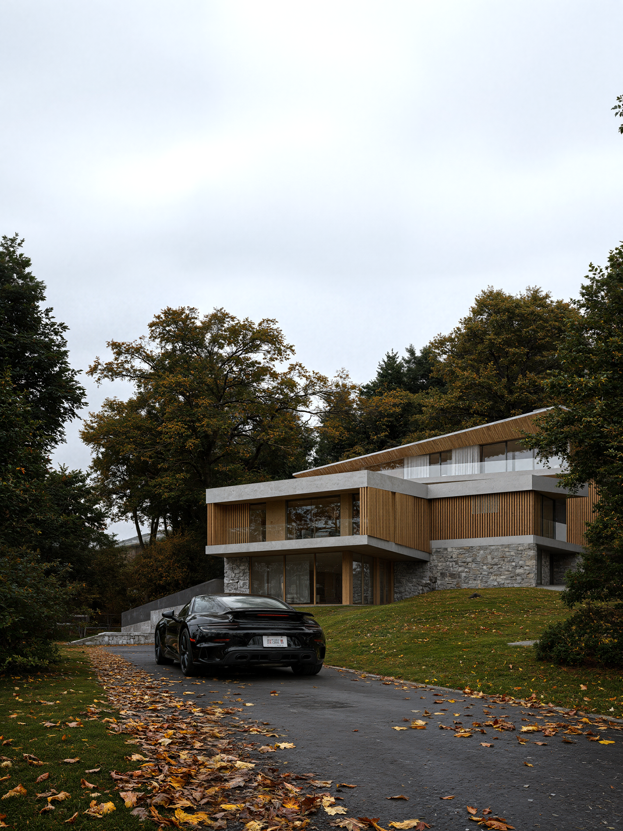 Фасадната композиция комбинира естествен камък, дървена облицовка и светъл бетон, създавайки спокойна и балансирана материална палитра, която се вписва естествено в природната среда. Големите остъклявания и просторните тераси разширяват връзката между вътрешното пространство и ландшафта.